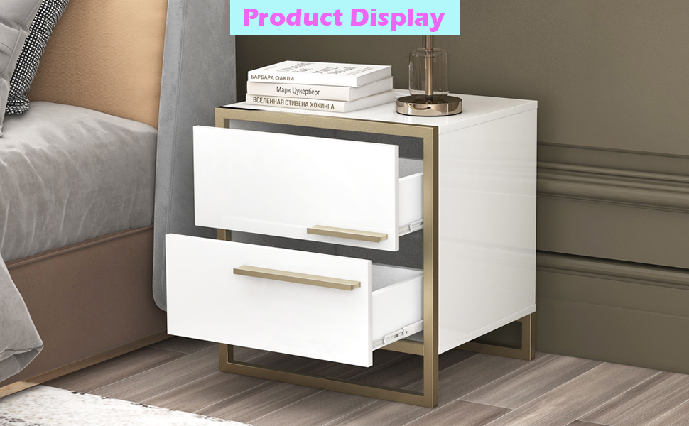 【Furniture】Nightstand with 2 Storage Drawers, Bedside Table with Gold Legs, End Table-Black